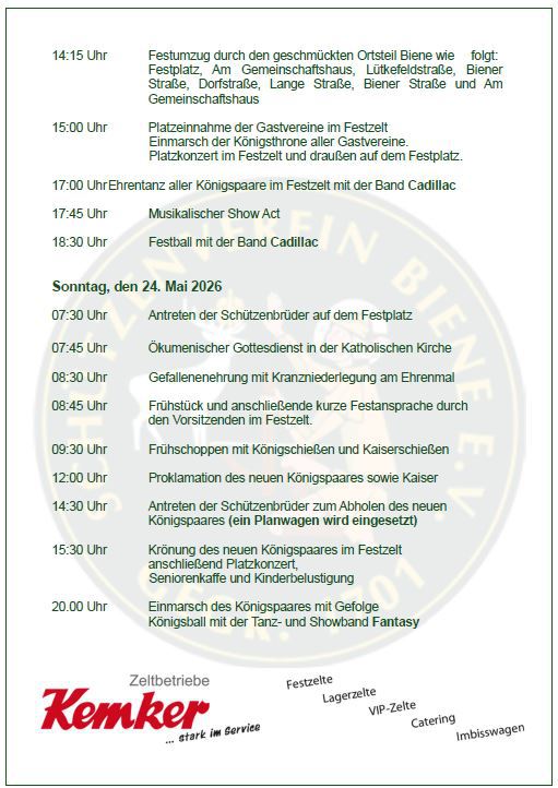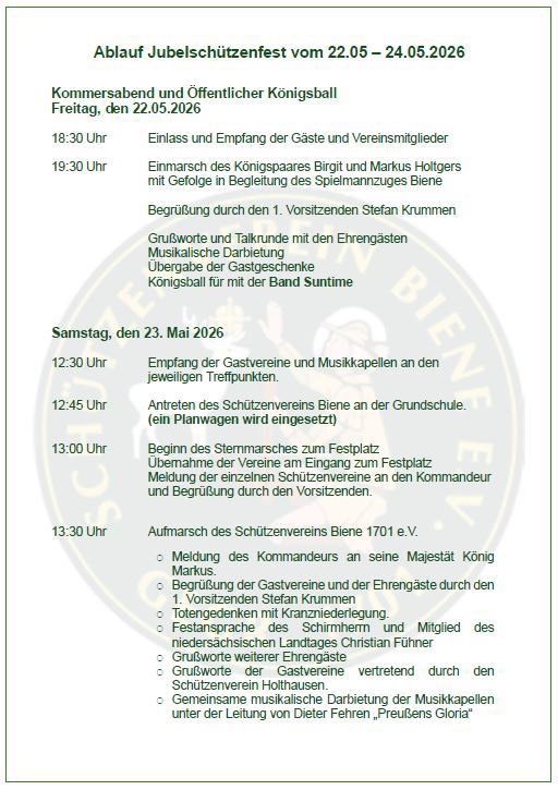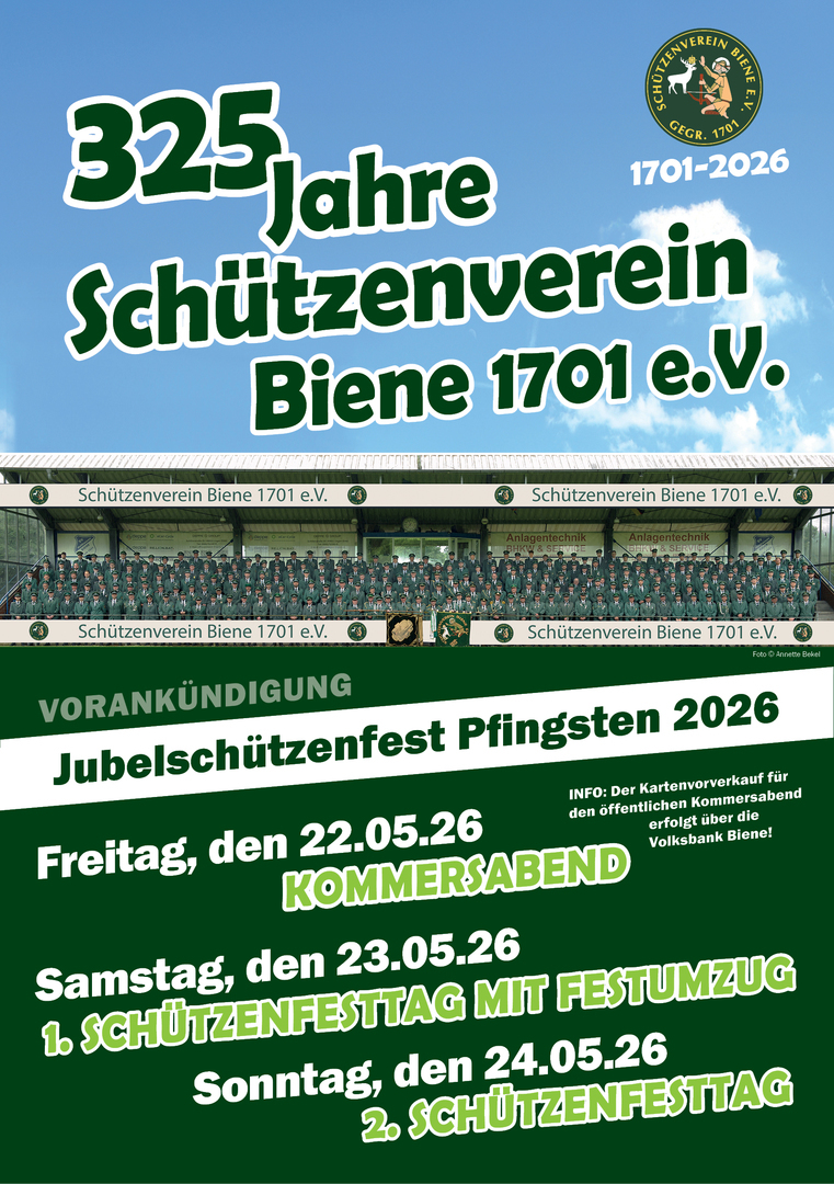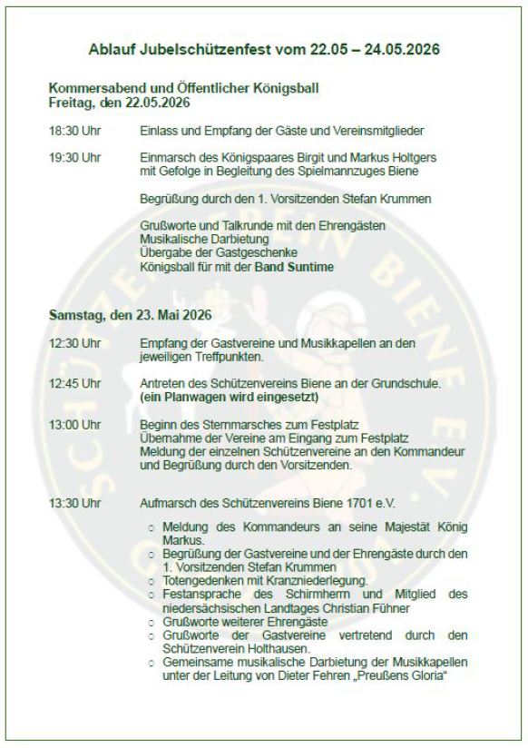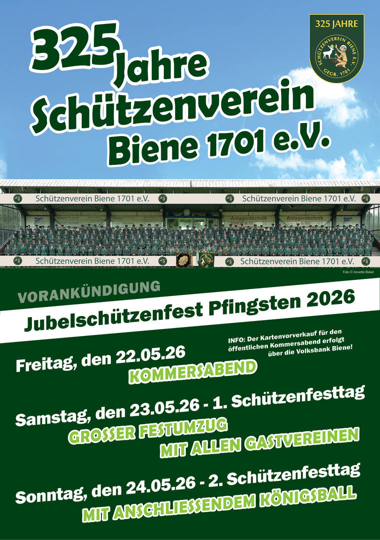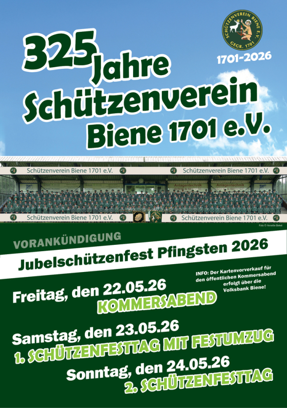 im Jahr 2026 begeht der Schützenverein Biene 1701 e. V. sein 325 jähriges Bestehen. Der Vorstand und Festausschuß des Vereins möchte auch zu diesem Jubelfest - wie bereits im Jahr 2001 - eine